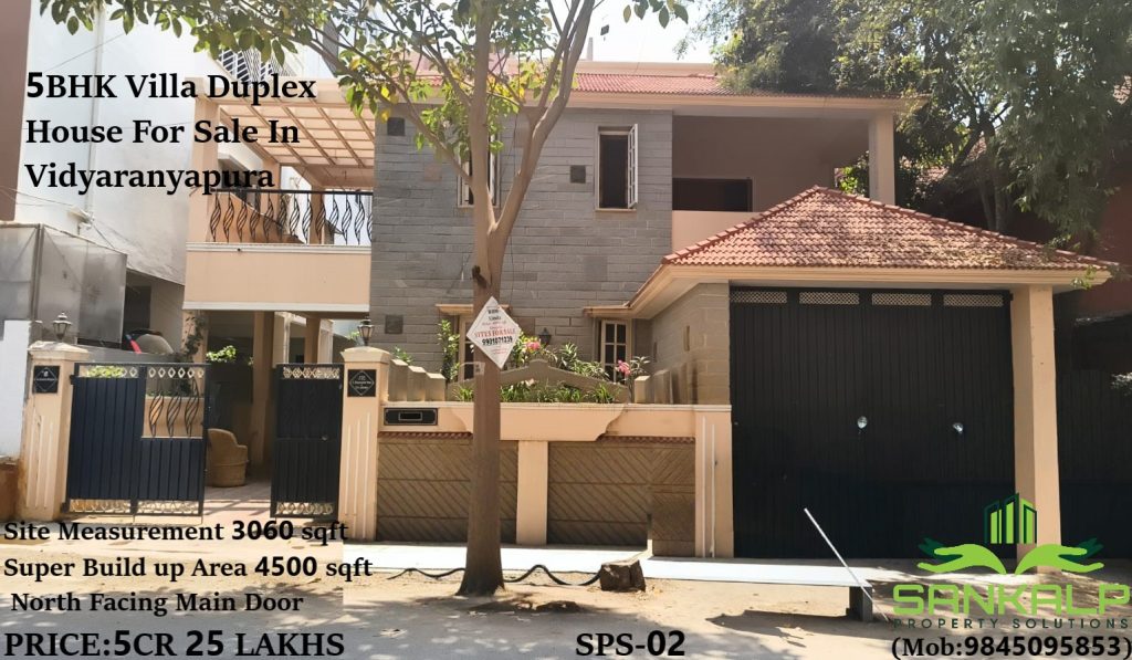 5BHK Villa Duplex House For Sale In VidyaranyapuraBy admin / April 2, 2026 Property Details 1) Site Measurement 3060 Sqft 2) Super Build up Area 4500 sqft 3) North Facing Main Door PRICE:5CR 25 LAKHS